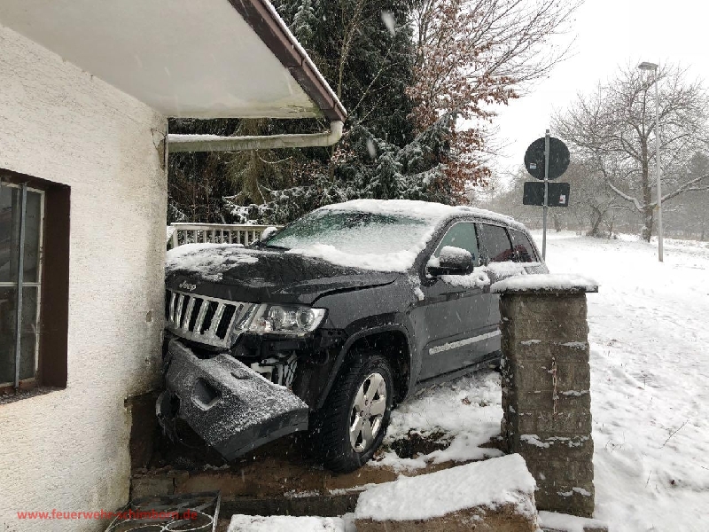 Aufgrund von Schneeglätte kam ein PKW ins schleudern und prallte gegen die Außenwand einer Garage. Die Straße wurde für den Verkehr gesperrt und abgesichert . Eine leichtverletzte Person dem Rettungsdienst übergeben