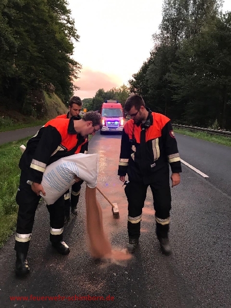 An einem landwirtschaftlich genutztem Fahrzeug war ein Hydraulikschlauch geplatzt. Auslaufendes Hydrauliköl verschmutzte die Fahrbahn auf einer Länge von ca. 2 Kilometern und einer Breite von bis zu 50 cm. Die Einsatzkräfte streuten die Betriebsstoffe mit Ölbindemittel ab. Polizei und Straßenmeisterei waren vor Ort.