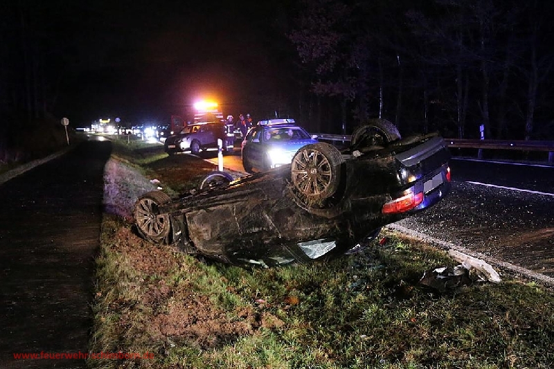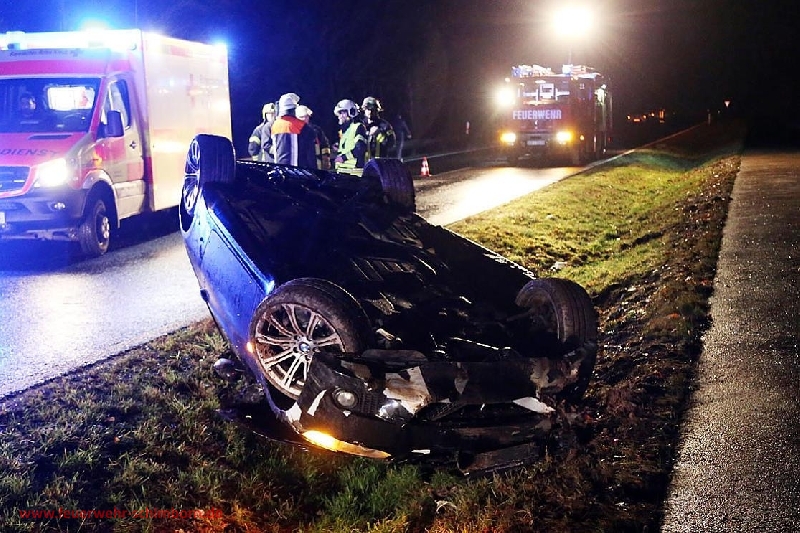 Ein PKW Fahrer kam auf das Bankett verlor die Kontrolle über das Fahrzeug und überschlug sich mehrfach.Das Fahrzeug blieb im Straßngraben auf dem Dach liegen. Der Fahrer wurde schwer verletzt und kam nach notärztlicher Erstversorgung ins Krankenhaus. Die Feuerwehr reinigte die Einsatzstelle und regelte den Verkehr. Die St 2307 war während der Rettung des Fahrers und zur Bergung des Fahrzeugs voll gesperrt.