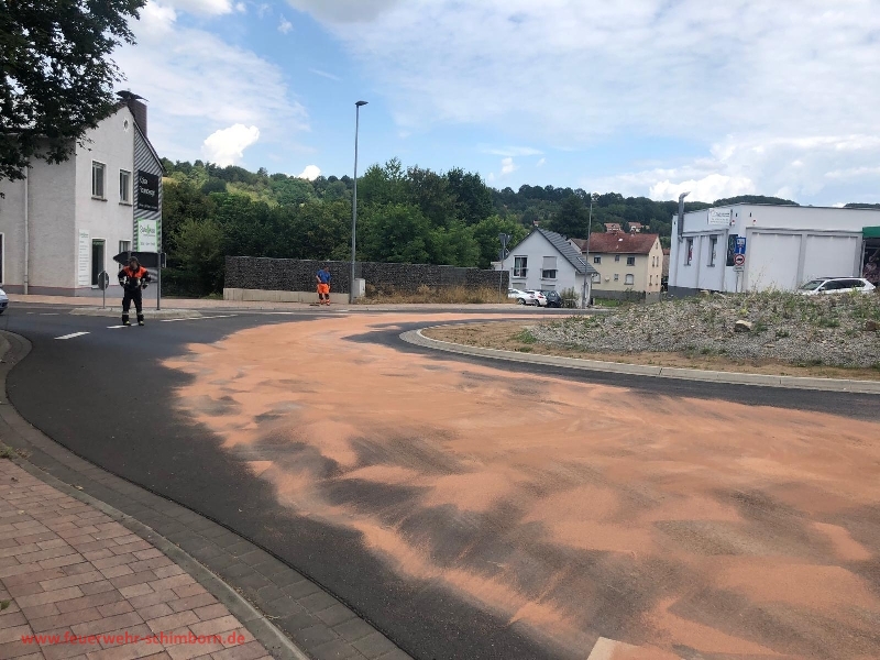 Eine ausgedehnte Dieselspur die den kompletten Kreisel und die Ausfahrten verschmutzte wurde durch die Feuerwehr und den gemeindlichen Bauhof beseitigt. Zum Ausschildern war die Straßenmeisterei vor Ort.