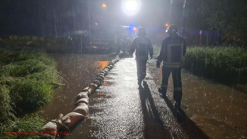 Wir leiteten mit Hilfe von unseren Sandsäcken und der tatkräftigen Unterstützung der FF Königshofen den "Fluss" in einen Kanalschacht. Die vollgelaufene Baugrube wurde von uns mit einer Chiemseepumpe geleert, was durch das hochdrückende Grundwasser massiv erschwerd wurde.
