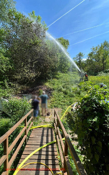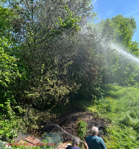 Wir wurden zu einem Freiflächenbrand in der Sandwiesenstraße gerufen. Hier hatte sich durch Funkenflug der ausgetrocknete Bewuchs entzündet.