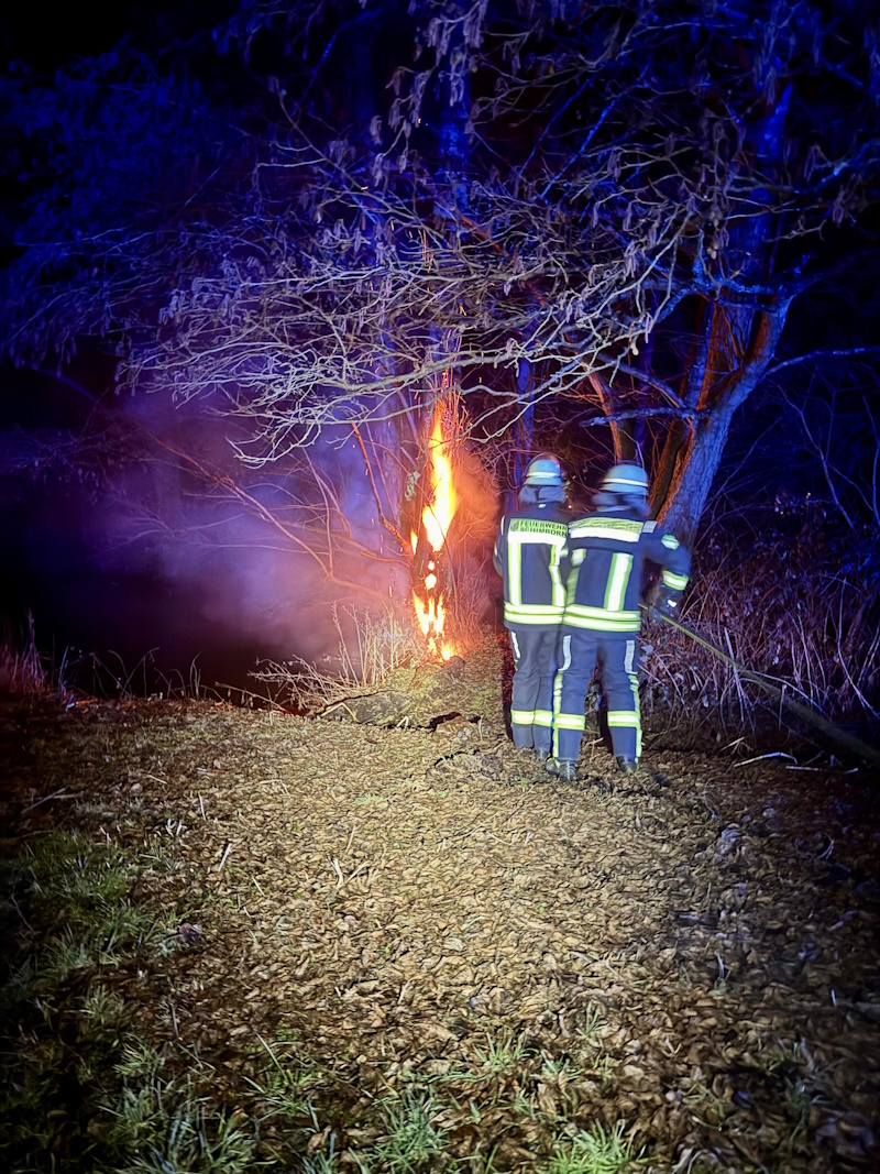 Wir wurden zu einem brennenden Baum direkt an der Kahl gerufen. Die ersten Löscharbeiten zeigten schnell Wirkung allerdings gestalteten sich die Nchlöscharbeiten schwierig da der hohle, morsche Baum im inneren massive Hitze und Glutnester hatte. Deshalb fällten wir den Baum und zerteilten ihn um besser das Löschmittel aufzubringen.